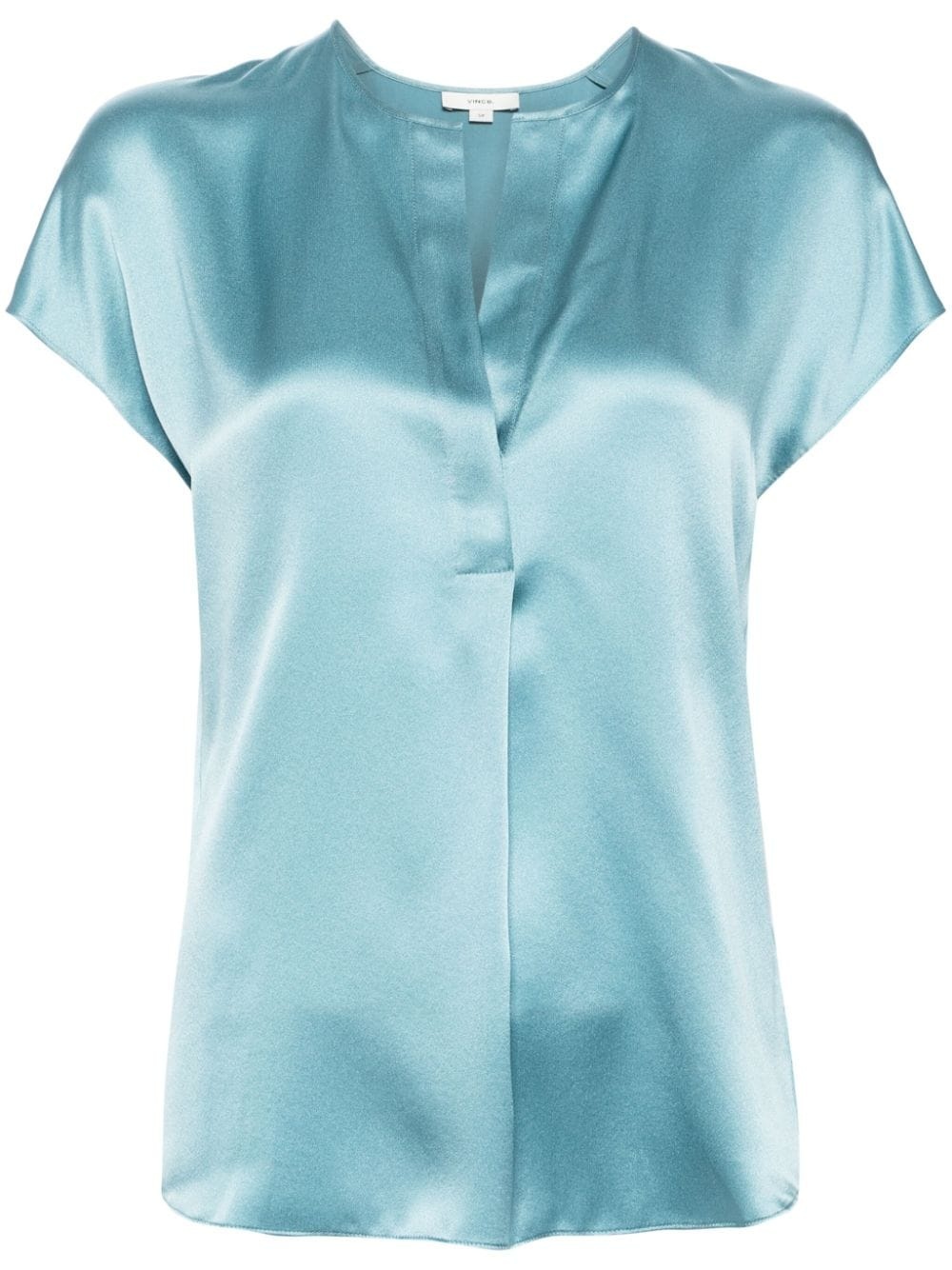 silk cap-sleeve blouse Highlights - Aqua blue - Silk - Satin weave - V-neck - Cap sleeves - Curved hem Made in United States Composition Silk 100% SIZE & FIT Model measurements Height 5 ft 9 in(1.76 m) Bust/Chest 31.1 in(79 cm) Hips 35.03 in(89 cm) Waist 24.4 in(62 cm) FittingInformation Designed to be unstructured, offering a loose fit throughout Made from a lightweight non-stretch fabric This piece fits true to size – take your usual size Washing instructions Hand Wash
