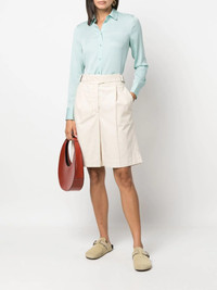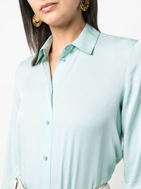 stretch-silk buttoned shirt baby blue stretch-silk classic collar long buttoned-cuff sleeves front button placket Imported Composition Silk 92%, Spandex/Elastane 8% SIZE & FIT Model measurements Height 5 ft 11 in(1.8 m) Bust/Chest 33.07 in(84 cm) Hips 37.4 in(95 cm) Waist 25.19 in(64 cm) Measurement CHEST 44.88 in(114 cm) HIPS 45.66 in(116 cm) LENGTH 27.95 in(71 cm) FittingInformation This piece fits true to size. We recommend you get your regular size Cut for a loose fit Made with a lightweight stretch fabric Washing instructions Hand Wash