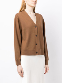 V-neck knitted cardigan Highlights - Caramel brown - Wool blend - Knitted construction - V-neck - Front button fastening - Long sleeves - Ribbed cuffs and hem - Straight hem Imported Composition Outer: Wool 78%, Cashmere 12%, Nylon 8%, Spandex/Elastane 2% Trims: Wool 78%, Cashmere 12% Nylon 8%, Elastane 2% SIZE & FIT Model measurements Height 5 ft 10 in(1.78 m) Bust/Chest 29.13 in(74 cm) Hips 35.43 in(90 cm) Waist 23.62 in(60 cm) Measurement CHEST 43.3 in(110 cm) SLEEVE LENGTH 22.44 in(57 cm) LENGTH 23.22 in(59 cm) FittingInformation Designed to be unstructured, offering a loose fit throughout Made with a midweight knit, this piece offers some stretch This piece fits true to size – take your usual size Washing instructions Hand Wash