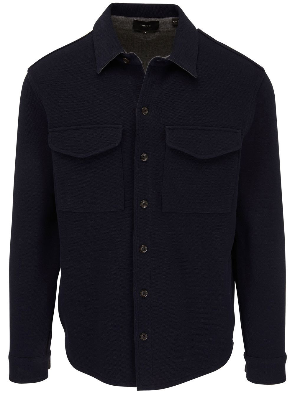 woven shirt jacket navy blue cotton blend classic collar chest flap pockets front button fastening long sleeves curved hem Made in United States Composition Cotton 86%, Polyester 14% SIZE & FIT Measurement CHEST 43.3 in(110 cm) SLEEVE LENGTH 24.8 in(63 cm) Shoulder Width 17.71 in(45 cm) Washing instructions Machine Wash
