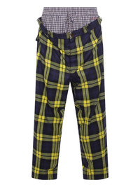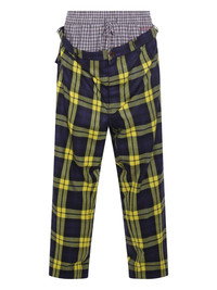 Builder check-pattern layered trousers Highlights - Navy and yellow - Check pattern - Layered design - Elasticated drawstring waistband - Button closure - Contrasting waistband Made in Italy Composition Virgin Wool 100% Washing instructions Read Manufacturer Guidelines