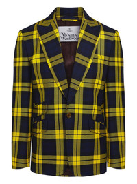 checked wool blazer Highlights - Navy blue and yellow - Checked pattern - Single button fastening - Notched lapels - Front flap pockets - Long sleeves Made in Italy Composition Virgin Wool 100% Washing instructions Read Manufacturer Guidelines