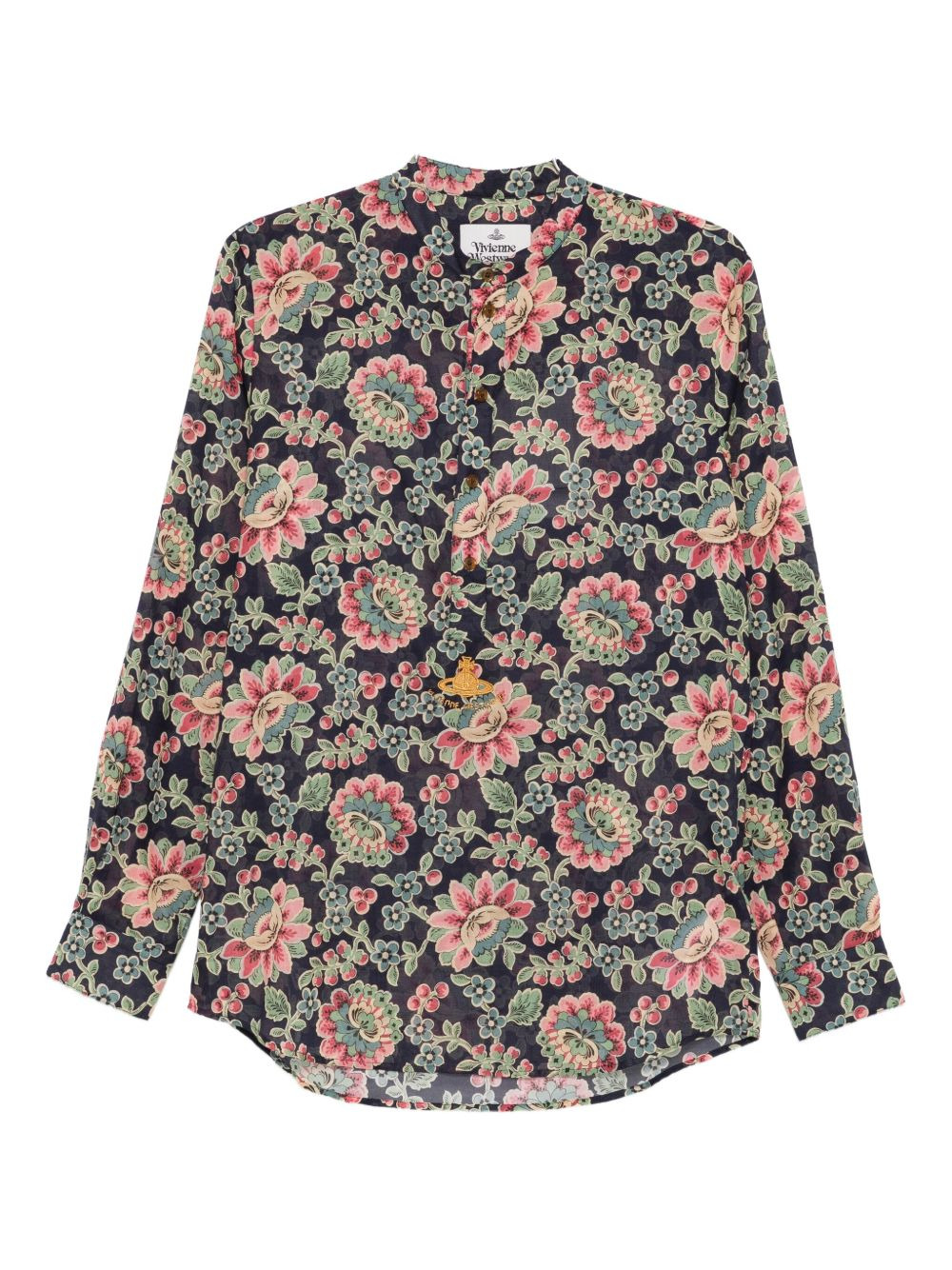 floral-print shirt Highlights - Blue - Floral print - Mock neck - Long sleeves - Front button fastening - Curved hem Imported Composition Organic Cotton 100%, Viscose 80%, Polyester 20% SIZE & FIT Model measurements Height 6 ft 2 in(1.87 m) Bust/Chest 37.79 in(96 cm) Hips 37.79 in(96 cm) Waist 30.31 in(77 cm) FittingInformation Designed for a relaxed fit, this piece allows for comfort and movement when worn Made from a lightweight non-stretch fabric Washing instructions Specialist Cleaning