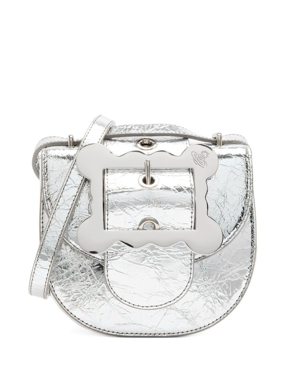Jodie buckle-embellished satchel Highlights - Silver - Metallic leather - Buckle detail - Magnetic fastening - Adjustable shoulder strap - Flap closure Made in France Composition Outer: Leather 100% Lining: Fabric 100% SIZE & FIT Measurement DEPTH 2.75 in(7 cm) HEIGHT 5.9 in(15 cm) STRAP 20.86 in(53 cm) WIDTH 6.49 in(16.5 cm)