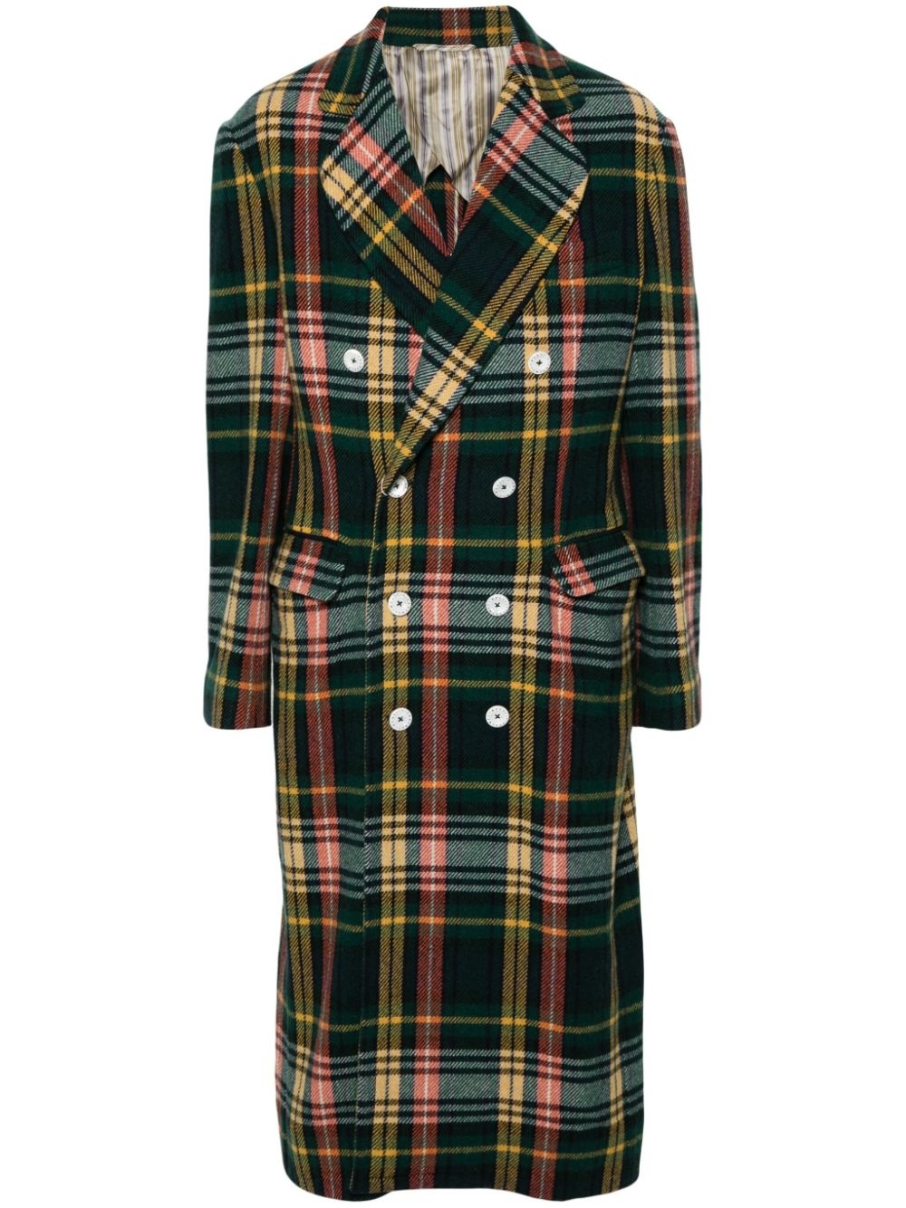 long wreck coat Highlights - Forest green/multicolour - Wool blend - Tartan check pattern - Wide notch lapels - Long sleeves - Buttoned cuffs - Chest welt pocket - Two side flap pockets - Central rear vent - Internal slip pocket - Unlined - Mid-calf length - Straight hem - Double-breasted button fastening Made in Italy Composition Outer: Wool 69%, Polyamide 26%, other fibers 5% Lining: Viscose 100%, Cotton 100% SIZE & FIT Model measurements Height 6 ft 2 in(1.88 m) Bust/Chest 36.61 in(93 cm) Hips 35.82 in(91 cm) Waist 27.95 in(71 cm) FittingInformation Designed for a slim fit, offering a comfortable fit that sits just away from the body The vented hem offers movement at the rear Made from a midweight non-stretch fabric This piece fits true to size – take your usual size