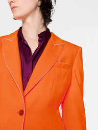 multiple-pocket single-breasted blazer Exhibiting Vivienne Westwood's punk roots, this blazer is imagined in a vivid neon orange hue. The single-breasted design boasts exaggerated front pockets that curve to the sides for an eye-catching finish. Highlights - Neon orange - Wide notch lapels - Shoulder pads - Long sleeves - Buttoned cuffs - Chest welt pocket - Side patch pockets - Straight hem - Front button fastening Made in Italy Composition Outer: Polyester 100% Lining: Polyester 100%, Viscose 100% SIZE & FIT Model measurements Height 5 ft 9 in(1.76 m) Bust/Chest 31.49 in(80 cm) Hips 36.61 in(93 cm) Waist 24.8 in(63 cm) Measurement SLEEVE LENGTH 24.4 in(62 cm) LENGTH 27.55 in(70 cm) Washing instructions Dry Clean Only