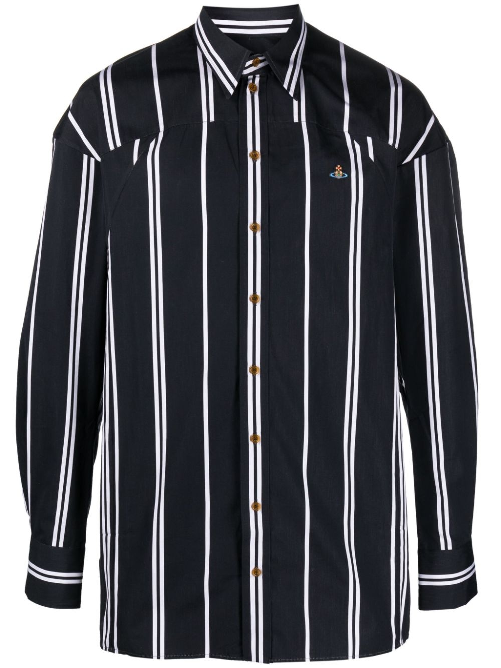 Orb-logo stripe-print shirt Vivienne Westwood elevates a classic silhouette with unmistakable detailing and an eye-catching print in this long-sleeve shirt. Rendered with stripes all over, this design is embroidered with the signature Orb logo: a motif that blends a symbol seen on the crown jewels with the rings of Saturn. Highlights - Black/white - Cotton - Stripe print - Signature orb logo print - Pointed flat collar - Long sleeves - Buttoned cuffs - Front button fastening - Straight hem Imported Composition Cotton 100%, Viscose 70%, Polyester 30% SIZE & FIT Model measurements Height 6 ft 2 in(1.89 m) Bust/Chest 37.79 in(96 cm) Hips 37 in(94 cm) Waist 29.92 in(76 cm) FittingInformation Designed for a relaxed fit, this piece allows for comfort and movement when worn Made from a midweight non-stretch fabric This piece fits true to size – take your usual size
