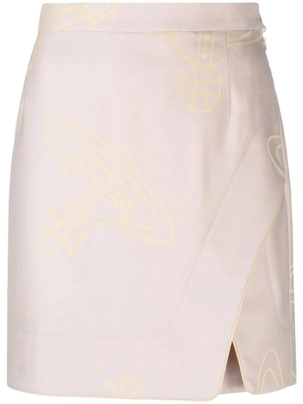 Rita Orb-print wrap skirt The Orb first appeared on Vivienne Westwood designs in the '80s. Now used in many iterations, it is featured on this wrap skirt as a large-scale graphic print, creating an instantly recognisable design. Highlights - Beige - Virgin wool - Signature orb logo print - Wrap design - High waist - Contrasting trim - Dart detailing - Side slit - Thigh-length - Logo-print lining - Internal padding at the stitched edge Made in Italy Composition Lining: Viscose 100% Outer: Virgin Wool 100% SIZE & FIT Model measurements Height 5 ft 10 in(1.78 m) Bust/Chest 30.7 in(78 cm) Hips 34.64 in(88 cm) Waist 23.22 in(59 cm) FittingInformation This piece fits true to size. We recommend you get your regular size Designed to be fitted at the waist and hips, loose over the leg Made with a mid-weight non-stretch fabric Washing instructions Dry Clean Only