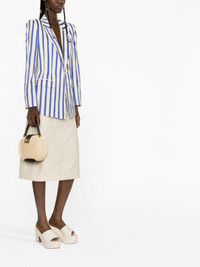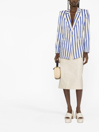 striped cotton blazer Crafted in Italy, this blazer by Vivienne Westwood features the brand's iconic orb logo embossed into its single-button fastening. A sharp silhouette is constructed from shoulder pads and peak lapels, whilst vertical blue and white stripes reflect the bold attitude of the brand. Highlights - Blue/white - Cotton - Shoulder pads - Peak lapels - Chest welt pocket - Long sleeves - Front button fastening - Embossed gold-tone button - Two front flap pockets - Straight hem - Full lining Made in Italy Composition Outer: Cotton 100% Lining: Viscose 51%, Cotton 49% SIZE & FIT Model measurements Height 5 ft 10 in(1.79 m) Bust/Chest 31.1 in(79 cm) Hips 35.03 in(89 cm) Waist 24.01 in(61 cm) FittingInformation Designed for a slim fit that sits just away from the body offering a close yet comfortable fit The internal shoulder pads offer a structured shape Made from a midweight non-stretch fabric This piece fits true to size – take your usual size Washing instructions Dry Clean Only