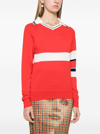 Calm polo shirt Highlights - Red/white - Wool-silk blend - Knitted construction - Polo collar - V-neck - Long sleeves - Stripe detailing - Ribbed cuffs and hem Imported Composition Wool 76%, Silk 24% SIZE & FIT Model measurements Height 5 ft 9 in(1.75 m) Bust/Chest 31.88 in(81 cm) Hips 34.64 in(88 cm) Waist 24.01 in(61 cm) Measurement SLEEVE LENGTH 22.99 in(58.4 cm) LENGTH 22.99 in(58.4 cm) WAIST 34.01 in(86.4 cm) BUST 34.01 in(86.4 cm) FittingInformation Designed for a slim fit that sits just away from the body offering a close yet comfortable fit Made with a midweight knit, this piece offers some stretch