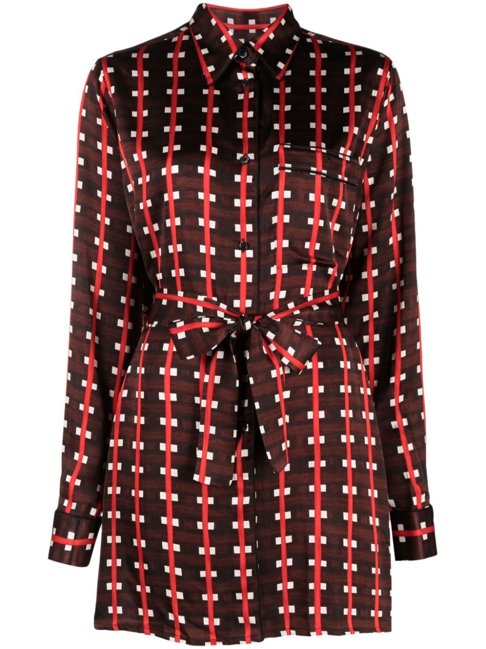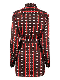 check-print tie-waist blouse A nod to Walles Bonner's penchant for vibrant colourways and statement motifs, this long-sleeve blouse is made in Italy from stretch jersey and emblazoned with a check print. It ties at the waist for an adjustable fit. Highlights - Brown/bright red/white - Check print - Classic collar - Front button fastening - Chest patch pocket - Tied waist - Long sleeves - Buttoned cuffs - Straight hem Made in Italy Composition Viscose 100% Washing instructions Machine Wash