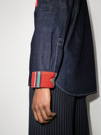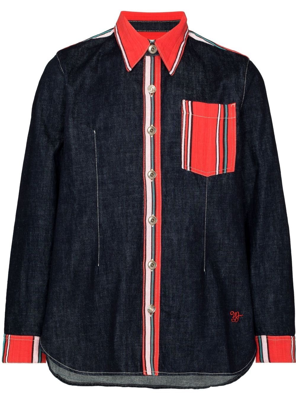 Cotonou patch pocket denim shirt Walles Bonner's timeless yet playful approach to garments is channelled by the brand's SS22 collection in pieces like the Cotonou denim shirt. Crafted from organic cotton in a classic navy shade, this piece is adorned with contrasting red accents, like a pointed collar and chest patch pocket. Highlights - Navy blue/light red/white - Organic cotton - Pointed flat collar - Front button placket - Long sleeves - Buttoned cuffs - Chest patch pocket - Buttoned cuffs - Curved hem Imported Composition Organic Cotton 100%, Cotton 100% SIZE & FIT Model measurements Height 6 ft 2 in(1.89 m) Bust/Chest 34.25 in(87 cm) Hips 36.22 in(92 cm) Waist 27.55 in(70 cm) FittingInformation This piece fits true to size. We recommend you get your regular size Cut for a loose fit Made with a mid-weight non-stretch fabric Washing instructions Dry Clean Only