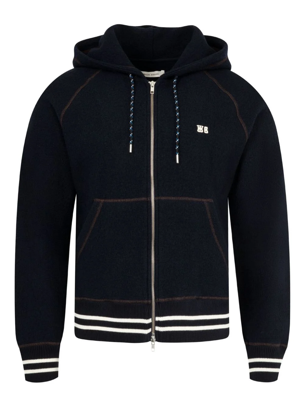 October zip-up hoodie Highlights - Navy blue - Raglan sleeves - Striped ribbed hem and cuffs - Zip fastening - Contrast stitching - Logo detail Imported Composition Wool 100% Washing instructions Read Manufacturer Guidelines