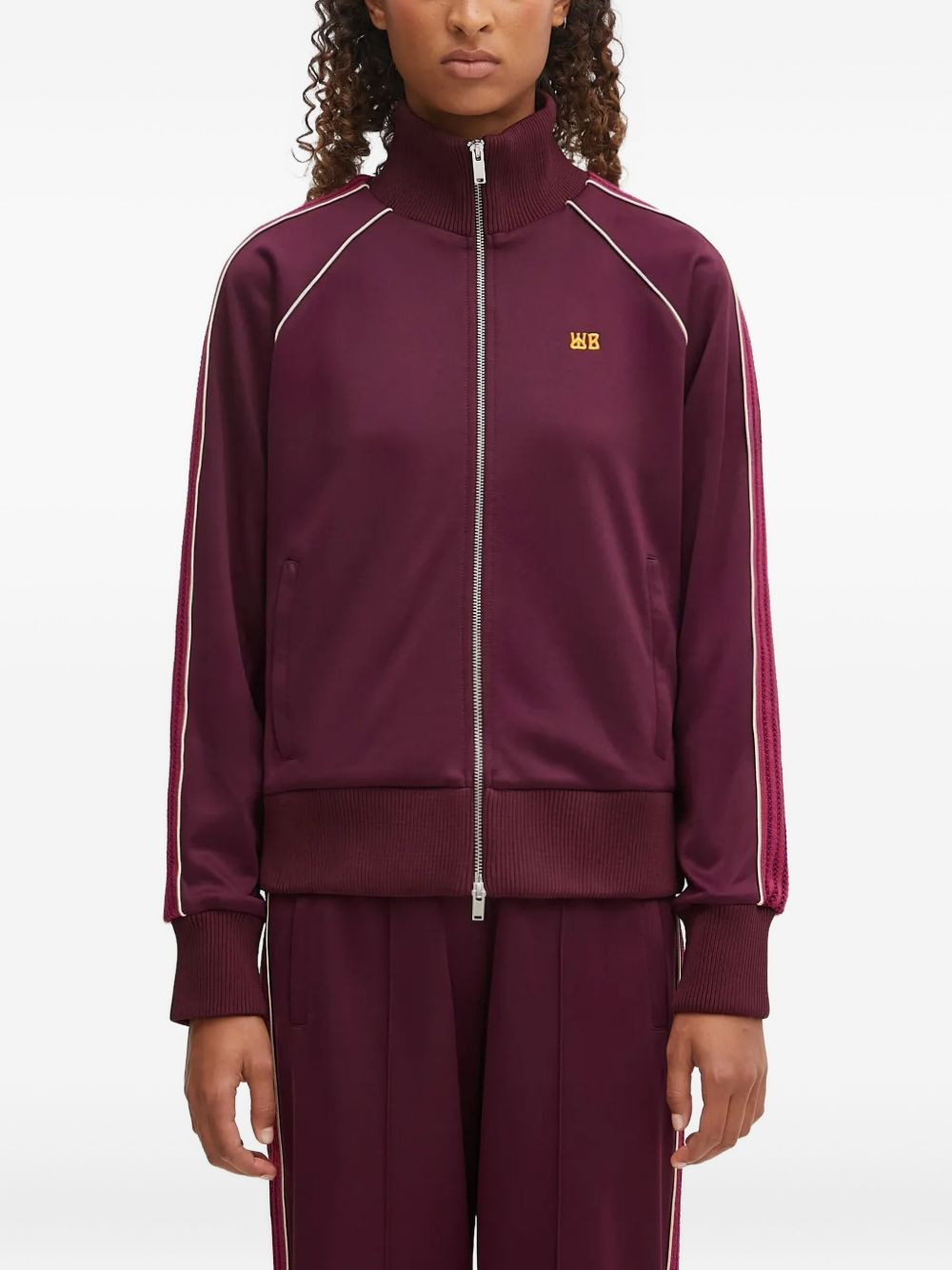 striped-panel zip-up track top Highlights - Burgundy - Stripe detail - Zip fastening - High neck - Ribbed hem - Long sleeves Imported Composition Outer: Polyester 55%, Cotton 45% Lining: Polyester 100% Washing instructions Read Manufacturer Guidelines