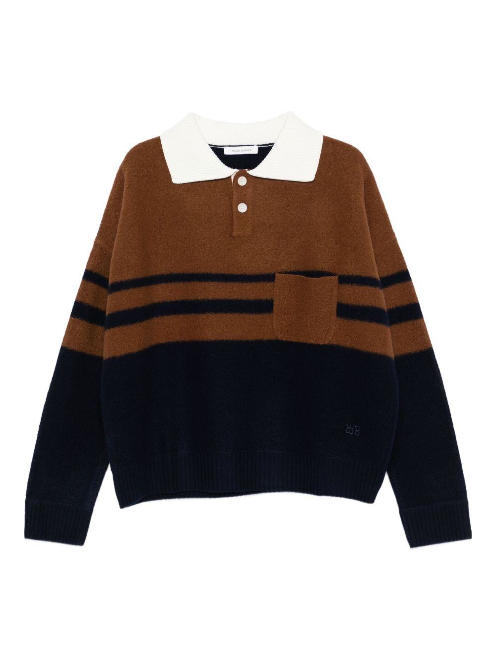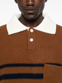 striped polo-neck sweater Highlights - Brown - Stripe detailing - Polo neck - Patch pocket - Button fastening - Long sleeves Imported Composition Polyester 100%, Wool 100% SIZE & FIT Model measurements Height 6 ft 0 in(1.84 m) Bust/Chest 37.79 in(96 cm) Hips 37 in(94 cm) Waist 31.49 in(80 cm) Washing instructions Hand Wash