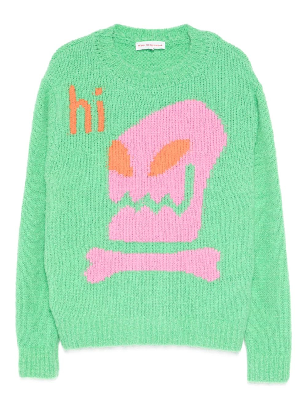 alien-intarsia jumper Highlights - Grass green - Crew neck - Long sleeves Imported Composition Wool 46%, Acrylic 30%, Polyamide 14%, Alpaca 10% SIZE & FIT Model measurements Height 6 ft 3 in(1.9 m) Bust/Chest 19.29 in(49 cm) Hips 38.58 in(98 cm) Waist 32.28 in(82 cm) FittingInformation Designed for a relaxed fit, this piece allows for comfort and movement when worn The ribbed hem offers a close, comfortable fit Made with a midweight knit, this piece offers some stretch Washing instructions Dry Clean Only