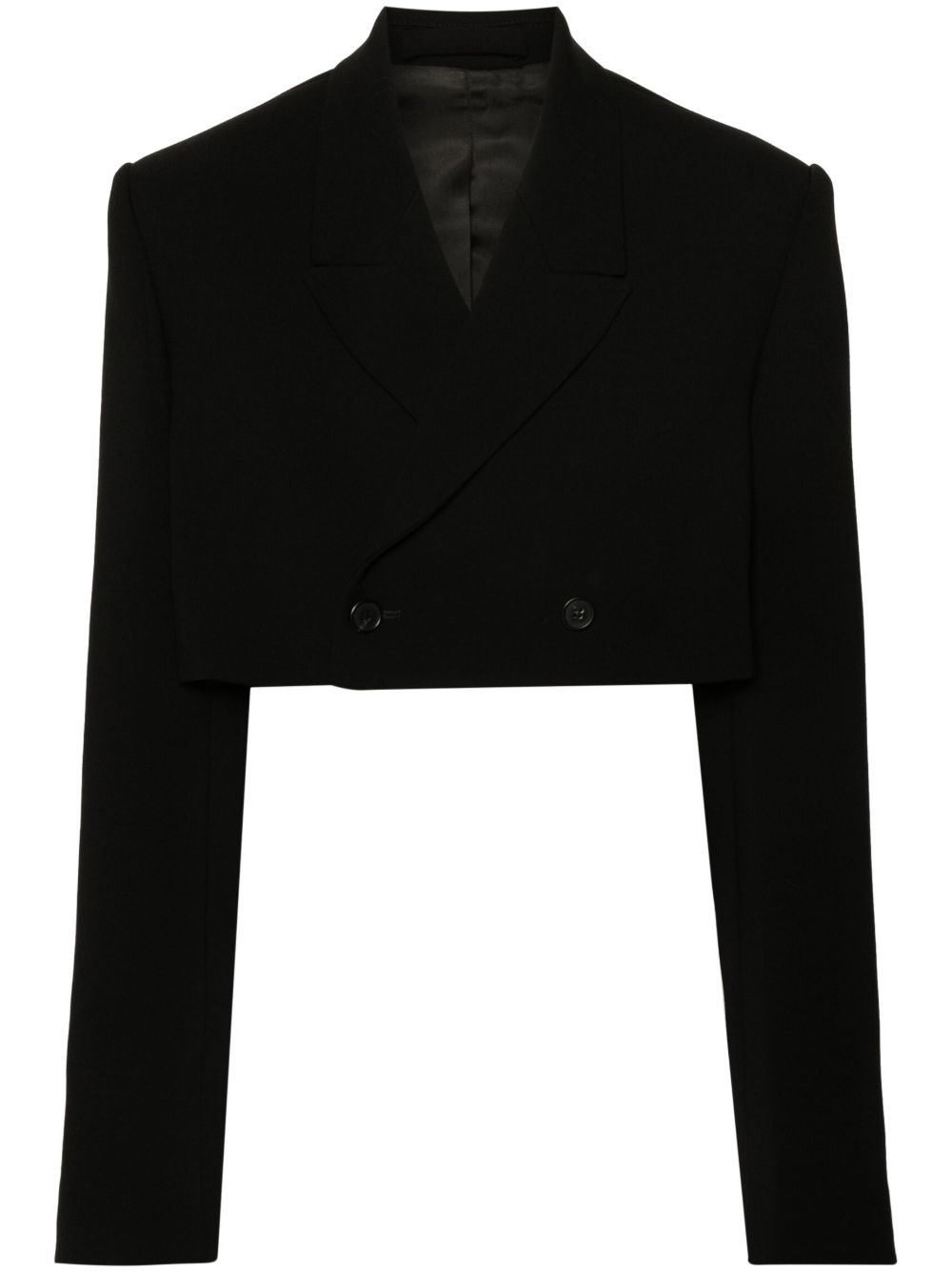 cropped blazer Highlights - Black - Virgin wool - Peak lapels - Double-breasted button fastening - Shoulder pads - Long sleeves - Cropped straight hem - Satin lining Imported Composition Outer: Virgin Wool 100% Lining: Viscose 100% SIZE & FIT Model measurements Height 5 ft 10 in(1.78 m) Bust/Chest 33.07 in(84 cm) Hips 36.61 in(93 cm) Waist 24.8 in(63 cm) FittingInformation Designed for a boxy fit, intended for a loose fit throughout The internal shoulder pads offer a structured shape Made from a midweight non-stretch fabric This piece fits true to size – take your usual size
