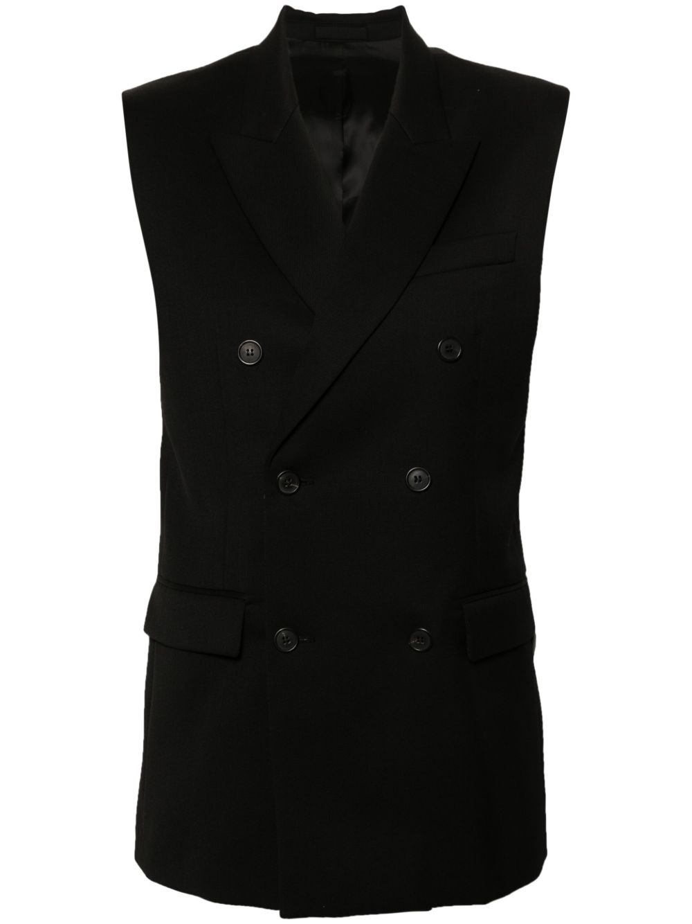 double-breasted gilet Highlights - Black - Virgin wool - Interlock weave - Peak lapels - Double-breasted button fastening - Shoulder pads - Sleeveless - Chest welt pocket - Two front flap pockets - English rear vents - Straight hem - Satin lining Imported Composition Outer: Virgin Wool 100% Lining: Viscose 100% SIZE & FIT Model measurements Height 5 ft 10 in(1.78 m) Bust/Chest 33.07 in(84 cm) Hips 36.61 in(93 cm) Waist 24.8 in(63 cm) FittingInformation Designed for a boxy fit, intended for a loose fit throughout The internal shoulder pads offer a structured shape Made from a midweight non-stretch fabric This piece fits true to size – take your usual size Washing instructions Dry Clean Only