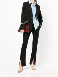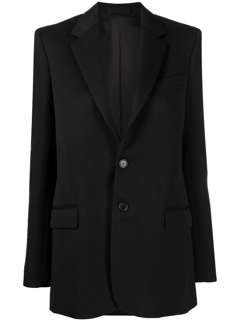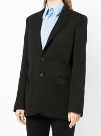 virgin wool single breasted blazer black virgin wool tailored cut classic lapels front button fastening two side welt pockets long sleeves Imported Composition Lining: Viscose 100% Body: Virgin Wool 100% SIZE & FIT Model measurements Height 5 ft 11 in(1.8 m) Bust/Chest 28.34 in(72 cm) Hips 35.43 in(90 cm) Waist 23.62 in(60 cm) Measurement SLEEVE LENGTH 25.59 in(65 cm) Shoulder Width 16.92 in(43 cm) LENGTH 29.52 in(75 cm) WAIST 38.58 in(98 cm) BUST 37.79 in(96 cm) FittingInformation This piece fits true to size. We recommend you get your regular size Cut for a loose fit Made with a mid-weight non-stretch fabric
