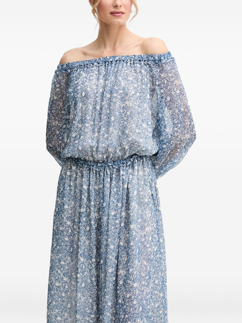 floral-print off-shoulder maxi dress Highlights - Light blue - Floral pattern - Off-shoulder neckline - Long sleeves - Elasticated waist Made in Italy Composition Silk 100% Washing instructions Read Manufacturer Guidelines