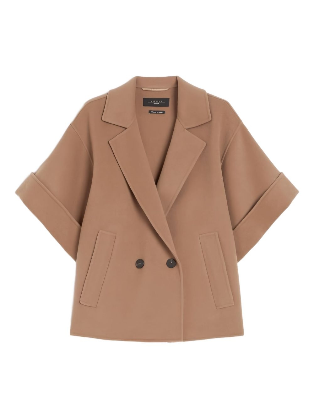 Pera double-breasted short coat Highlights - Brown - Virgin wool - Double-breasted fastening - Short sleeves - Wide cuffs - Side pockets Made in Italy Composition Virgin Wool 100% Washing instructions Dry Clean Only