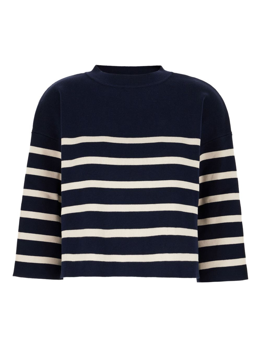 striped rib-knit sweater Highlights - Navy blue - Cream stripes - Rib-knit texture - Three-quarter sleeves - Round neck Imported Composition Cotton 100% Washing instructions Read Manufacturer Guidelines