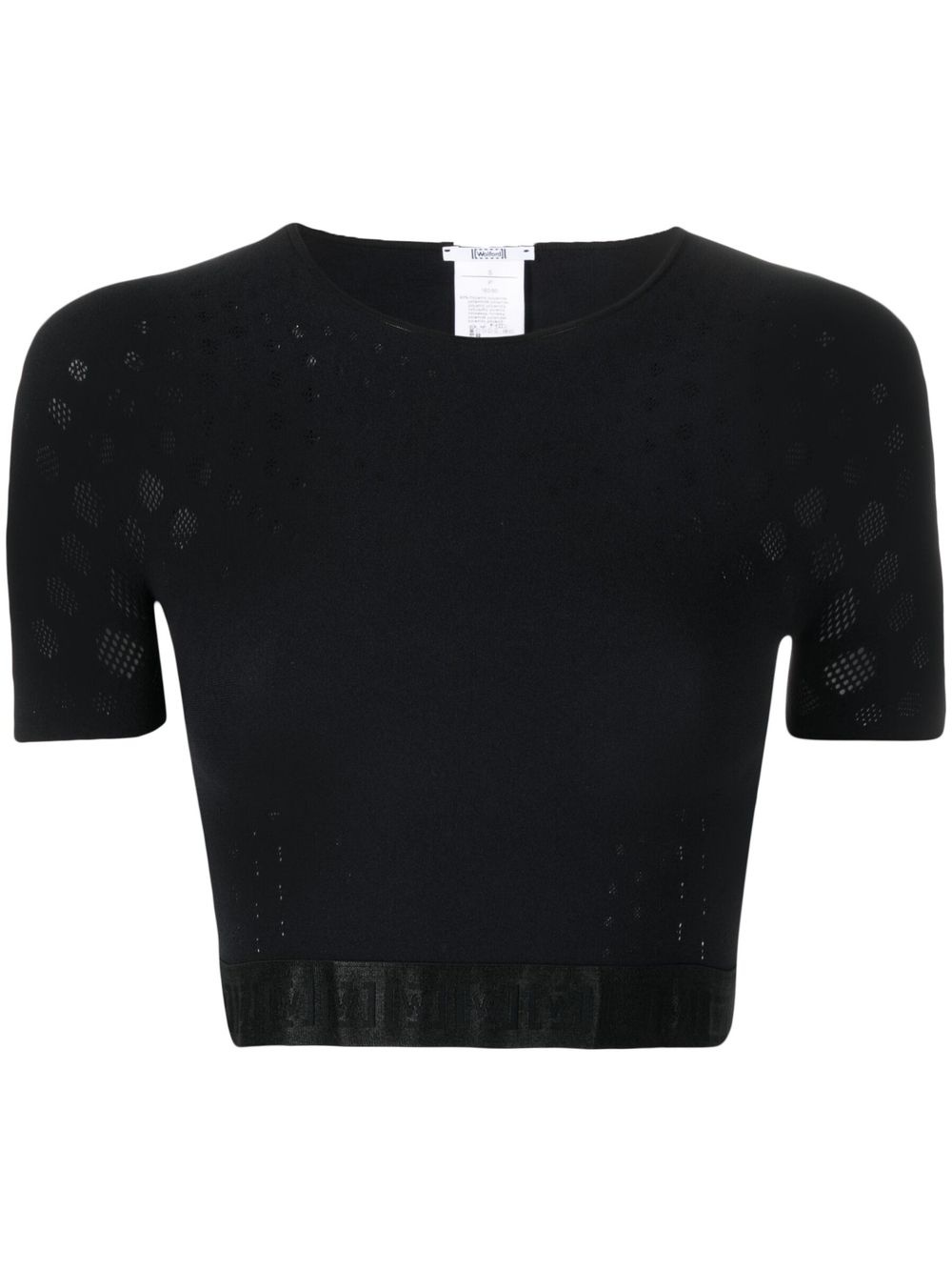 semi-sheer cropped top black stretch-design semi-sheer construction mesh panelling crew neck short sleeves elasticated hem Made in Italy Composition Polyamide 83%, Elastane 17% SIZE & FIT Model measurements Height 5 ft 10 in(1.77 m) Bust/Chest 31.1 in(79 cm) Hips 34.64 in(88 cm) Waist 25.19 in(64 cm) FittingInformation This piece fits true to size. We recommend you get your regular size Cut for a close fit Made with a mid-weight stretch fabric