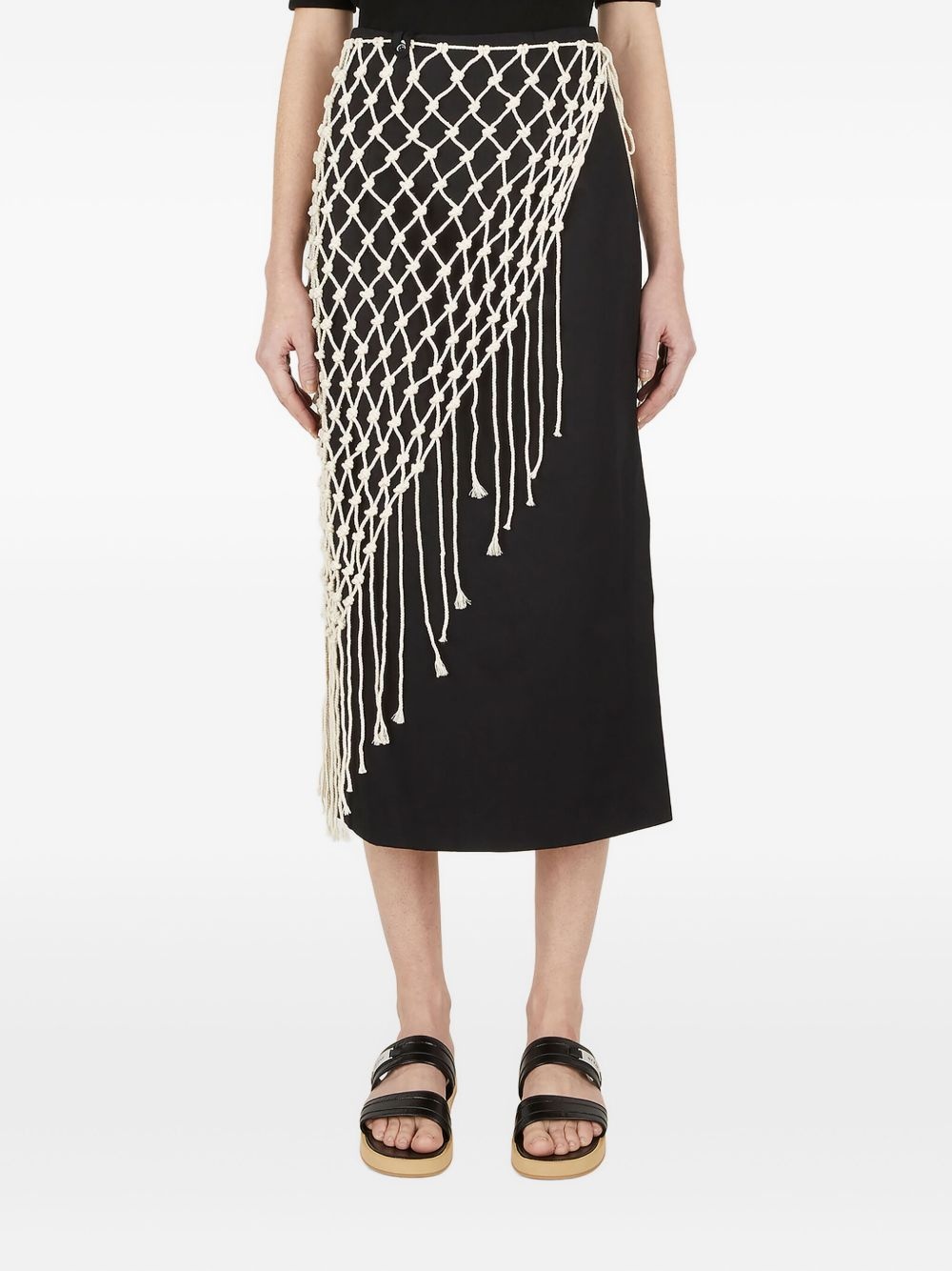 macrame-overlay skirt Highlights - Black - Cotton weave - High waist - Concealed zip fastening - Detachable macrame overlay - Fringed trim - Side split Imported Composition Outer: Cotton 100% Lining: Polyester 55%, Viscose 45% Washing instructions Dry Clean Only