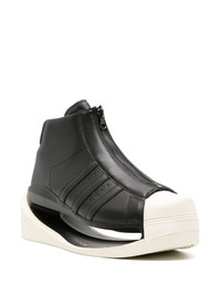 Gendo Pro high-top sneakers Y-3 is rooted in experimental design, and the Gendo Pro sneakers are proof. Negative space and elevation are key themes reflected in the futuristic hollowed flatform sole, which juxtaposes the classic archival upper crafted from calf leather. A front zip fastening adds further unexpected detail, while the 3-Stripes at the sides add an iconic finishing touch. Highlights - Black/off-white - Calf leather - Smooth grain - Signature 3-stripes logo to the side - Round toe - Signature shell toe - Front zip fastening - Chunky sole with cut-out detailing - Branded leather insole - Leather lining Imported Composition Sole: Rubber 100% Outer: Calf Leather 100% Lining: Calf Leather 100% SIZE & FIT Measurement HEEL 3.34 in(8.5 cm) PLATFORM 1.96 in(5 cm)
