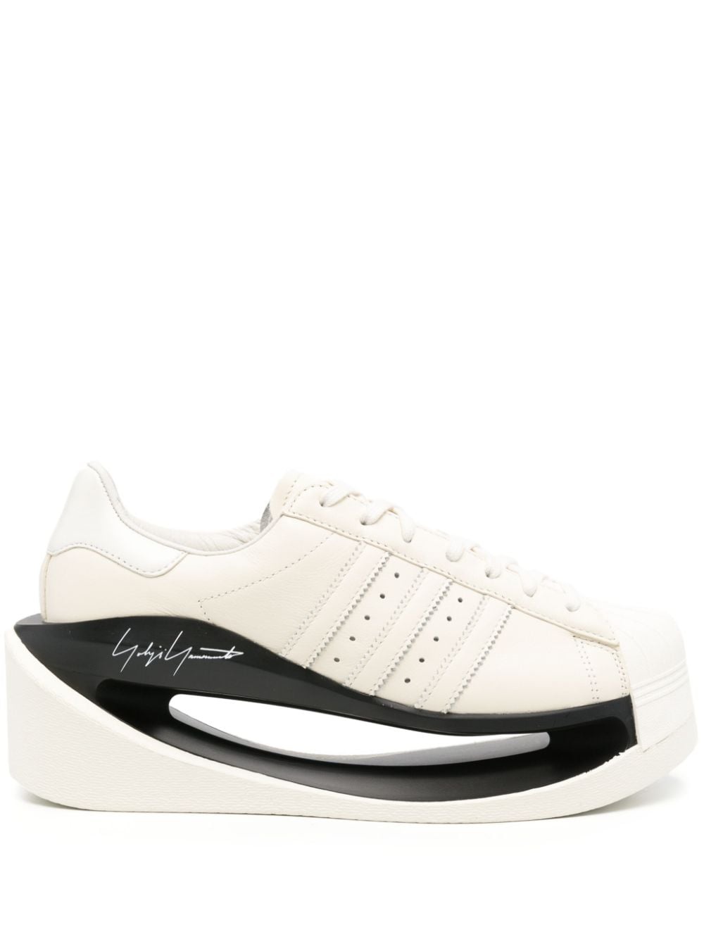 Gendo Superstar leather sneakers Highlights - Cream white/black - Calf leather - Panelled design - Round toe - Logo print to the side - Signature monofilament side-stripe detail - Cut-out detailing - Padded ankle - Branded leather insole - Rubber sole - Front lace-up fastening - When buying this unisex item, keep in mind that it is graded in standard men's sizing. Imported Composition Leather 100% SIZE & FIT Measurement HEEL 2.75 in(7 cm) PLATFORM 1.77 in(4.5 cm)