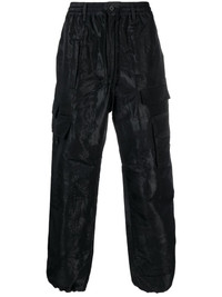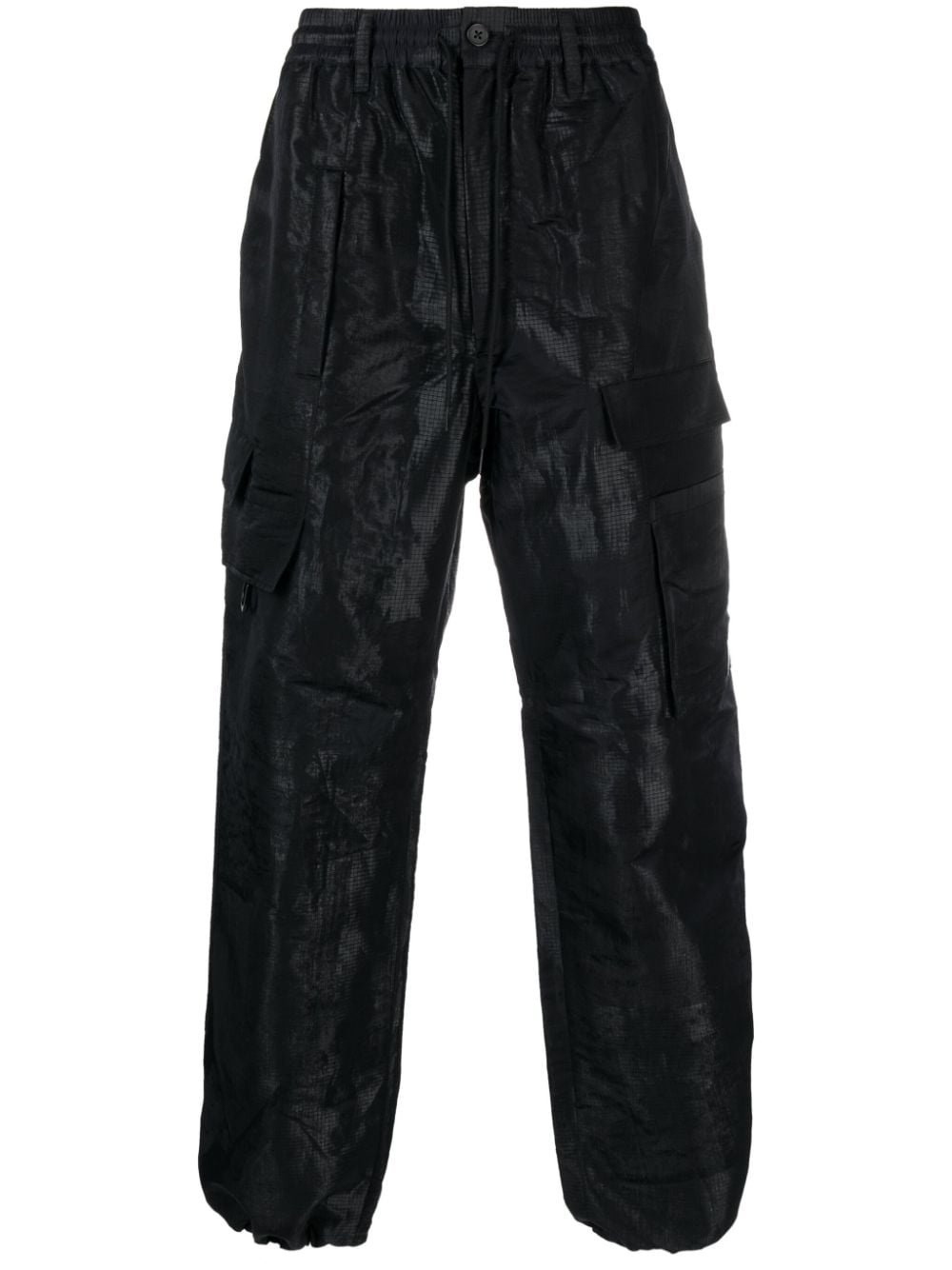 jacquard ripstop cargo trousers Y-3 takes inspiration from 'classic and functional design approaches' to present these trousers, textured with a jacquard ripstop effect. Cut to a relaxed silhouette with practical cargo pockets, they're complete with a brushstroke graphic that pays homage to past Yohji Yamamoto collections. Highlights - Black - Recycled polyester - Ripstop texture - Jacquard - Elasticated drawstring waistband - Front button fastening - Two side cargo pockets - Straight leg Imported Composition Lining: Recycled Polyester 100% Outer: Polyamide 66%, Polyester 34% SIZE & FIT Model measurements Height 6 ft 2 in(1.89 m) Bust/Chest 35.03 in(89 cm) Hips 38.18 in(97 cm) Waist 29.92 in(76 cm) FittingInformation Designed with a wide leg, offering a loose and roomy fit The internal drawstring at the hem allows for fitted preferences at the ankle Made from a midweight non-stretch fabric This piece fits true to size – take your usual size Washing instructions Machine Wash