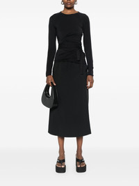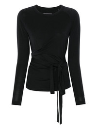 long-sleeves T-shirt Highlights - Black - Side tie fastening - Signature 3-stripes logo - Crew neck - Draped detailing Imported Composition Lyocell 93%, Elastane 7% SIZE & FIT Model measurements Height 5 ft 11 in(1.8 m) Bust/Chest 31.49 in(80 cm) Hips 36.61 in(93 cm) Waist 24.4 in(62 cm) FittingInformation Designed for a slim fit that sits just away from the body offering a close yet comfortable fit The tie fastening gives an adaptable and personalised fit Made from a midweight stretch fabric, this piece offers elasticity and flexibility when worn