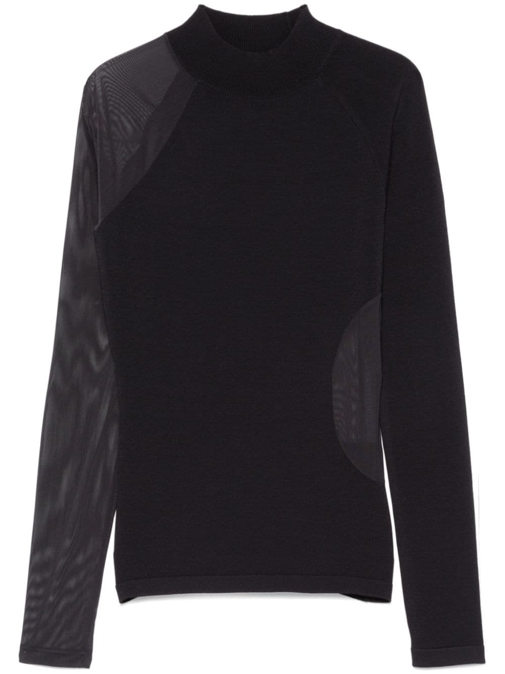 mesh-detailing top Highlights - Black - Recycled polyamide - Mesh detailing - Semi-sheer construction - Fine knit - Ribbed mock neck - Long sleeves - Straight hem Imported Composition Viscose 83%, Recycled Polyamide 79%, Elastane 21%, Recycled Polyester 17% SIZE & FIT Model measurements Height 5 ft 11 in(1.8 m) Bust/Chest 31.49 in(80 cm) Hips 36.61 in(93 cm) Waist 24.4 in(62 cm) FittingInformation Designed for a slim fit that sits just away from the body offering a close yet comfortable fit Made from a lightweight fabric