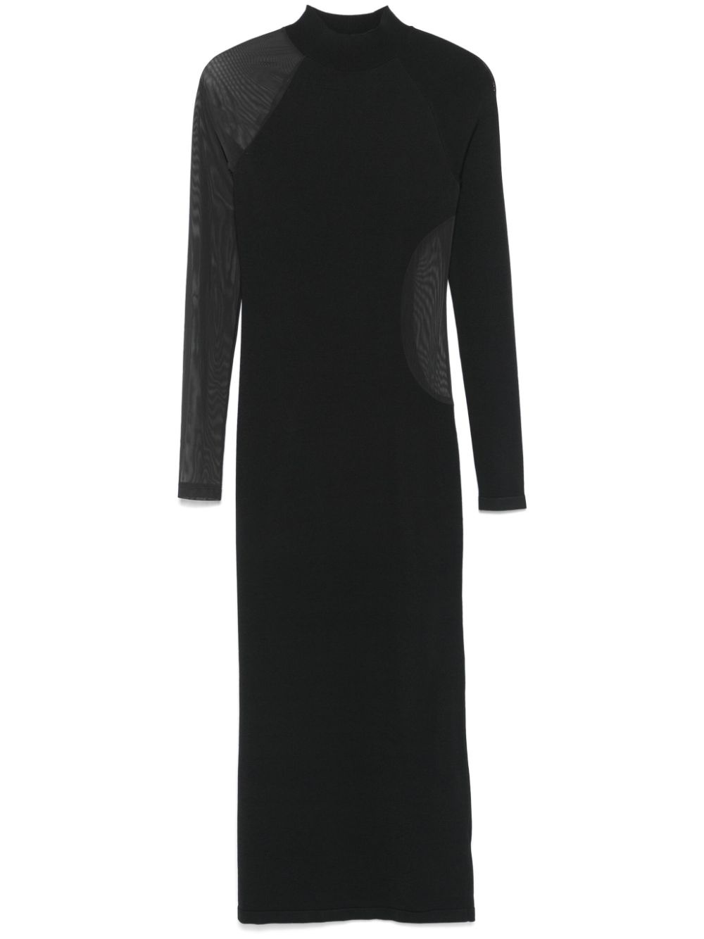 panelled midi dress Highlights - Black - Recycled polyamide blend - Knitted construction - Panelled design - Mock neck - Semi-sheer panels - Long raglan sleeves - Rubberised logo to the rear - Unlined - Straight hem - Mid-length Imported Composition Viscose 83%, Recycled Polyamide 79%, Elastane 21%, Recycled Polyester 17% SIZE & FIT Model measurements Height 5 ft 10 in(1.78 m) Bust/Chest 33.85 in(86 cm) Hips 36.61 in(93 cm) Waist 26.77 in(68 cm) FittingInformation Designed for a close fit throughout Made from a midweight fabric Washing instructions Machine Wash