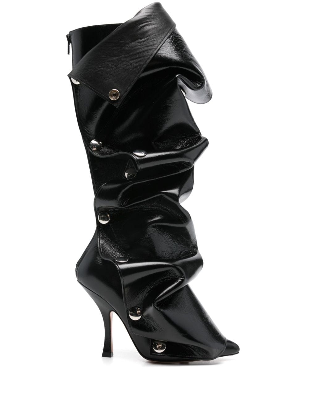 110mm Snap boots Highlights - Black - Calf leather - Crinkled finish - Patent finish - Rear zip fastening - 110mm stiletto heel - Press-stud embellishment - Detachable panels - Pointed toe - Branded leather insole - Rubber sole Made in Italy Composition Sole: Calf Leather 100%, Rubber 100% Lining: Calf Leather 100% Outer: Calf Leather 100% SIZE & FIT Measurement CIRCUMFERENCE 12.59 in(32 cm) HEEL 3.93 in(10 cm) HEIGHT 13.77 in(35 cm)