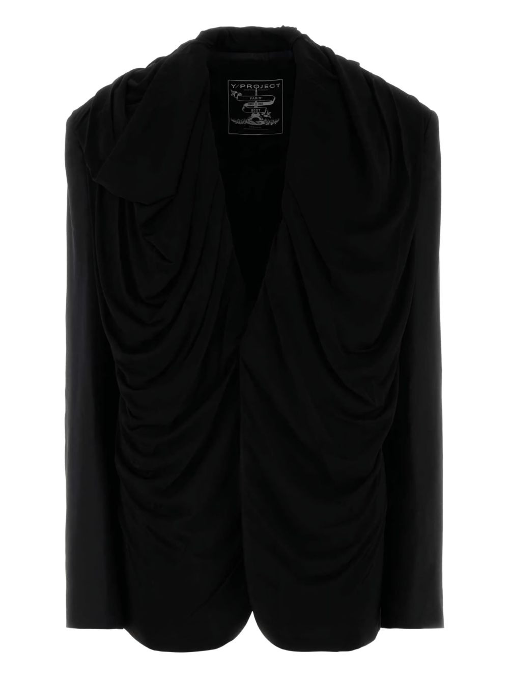 draped hooded blazer Highlights - Black - Mesh layer - Classic hood - Draped detailing - Front button fastening - Shoulder pads - Long sleeves - Buttoned cuffs - Central rear vent - Internal slip pocket - Straight hem - When buying this unisex item, keep in mind that it is graded in standard men's sizing. Imported Composition Outer: Polyester 53%, Wool 43%, Elastane 4% Lining: Viscose 100%, Cellulose 100% SIZE & FIT FittingInformation This unisex piece is designed for a loose fit whether you usually select women's or men's sizes The vented hem offers movement at the rear Made from a midweight fabric