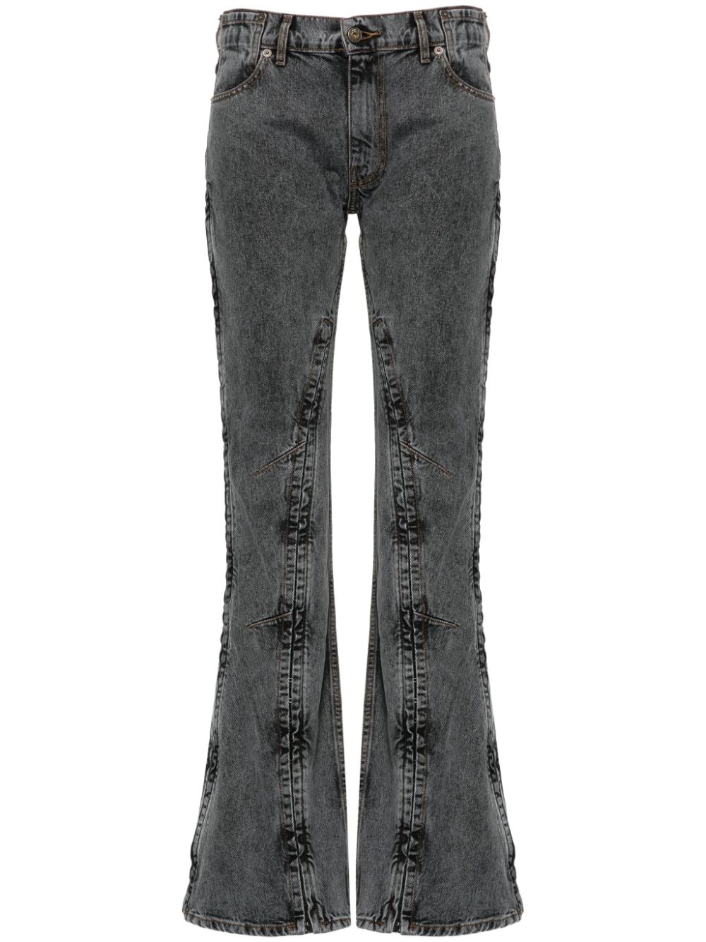 faded bootcut jeans Y/Project is renowned for its irreverent aesthetic, and these black jeans are proof. Made from sturdy organic cotton denim to a flared silhouette, they're fitted with hook and eye fastenings from the hem to the thigh, lending an element of personalisation. Highlights - Black - Faded effect - Organic cotton - Denim - Belt loops at the waist - Classic five pockets - Logo patch to the rear - Hook and eye detailing - Internal logo tag - Bootcut - Front button and zip fastening Imported Composition Organic Cotton 100% SIZE & FIT Model measurements Height 5 ft 11 in(1.8 m) Bust/Chest 32.67 in(83 cm) Hips 36.22 in(92 cm) Waist 24.4 in(62 cm) FittingInformation Designed with a flared hem, these jeans allow for a close fit at the waist with a slim fit over the leg and widening towards the hem Sturdy and hard-wearing, this denim piece offers no stretch This piece fits true to size – take your usual size