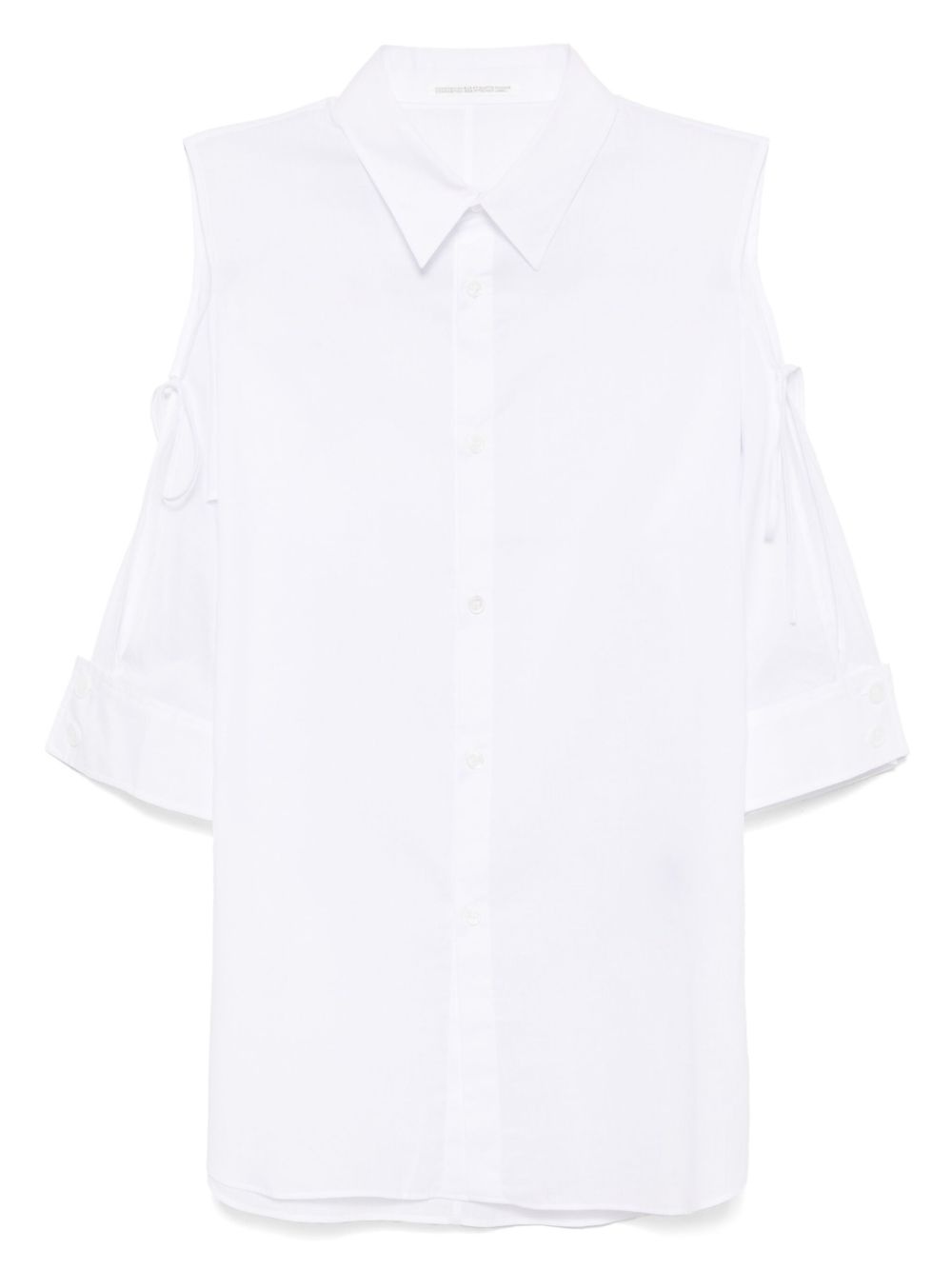 asymmetrical-shoulder shirt Highlights - White - Front button fastening - Cut-out detailing - Buttoned cuffs Imported Composition Cotton 100% SIZE & FIT Model measurements Height 5 ft 10 in(1.78 m) Bust/Chest 29.92 in(76 cm) Hips 34.64 in(88 cm) Waist 24.8 in(63 cm) FittingInformation Designed to be unstructured, offering a loose fit throughout Made from a lightweight non-stretch fabric
