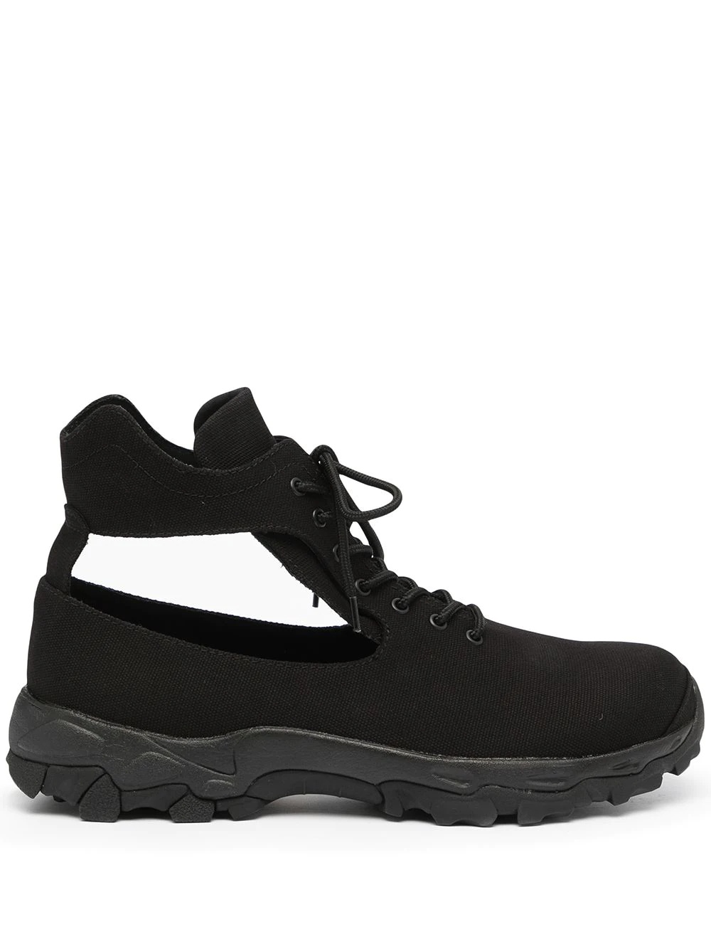 cut-out canvas high-top sneakers Yohji Yamamoto's sneakers showcase the brand's experimental aesthetic. Set on ridged rubber soles, this black cotton-canvas iteration has a high-top silhouette cut-outs at the sides. Imported Composition Sole: Rubber 100% Outer: Cotton 100% Lining: Fabric 100% SIZE & FIT Measurement Sole height 1.57 in(4 cm)