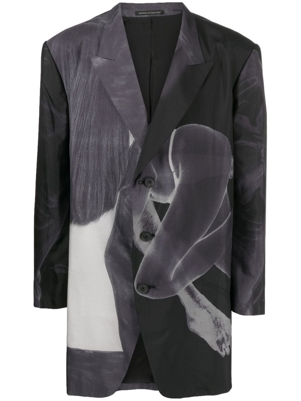 graphic-print single-breasted blazer black/grey/cloud white silk all-over graphic print notched lapels front button fastening long sleeves long length Imported Composition Body: Silk 100% SIZE & FIT Model measurements Height 6 ft 2 in(1.87 m) Bust/Chest 36.22 in(92 cm) Hips 37.79 in(96 cm) Waist 28.34 in(72 cm) FittingInformation This piece fits true to size. We recommend you get your regular size Cut for a loose fit Made with a lightweight non-stretch fabric Washing instructions Dry Clean Only