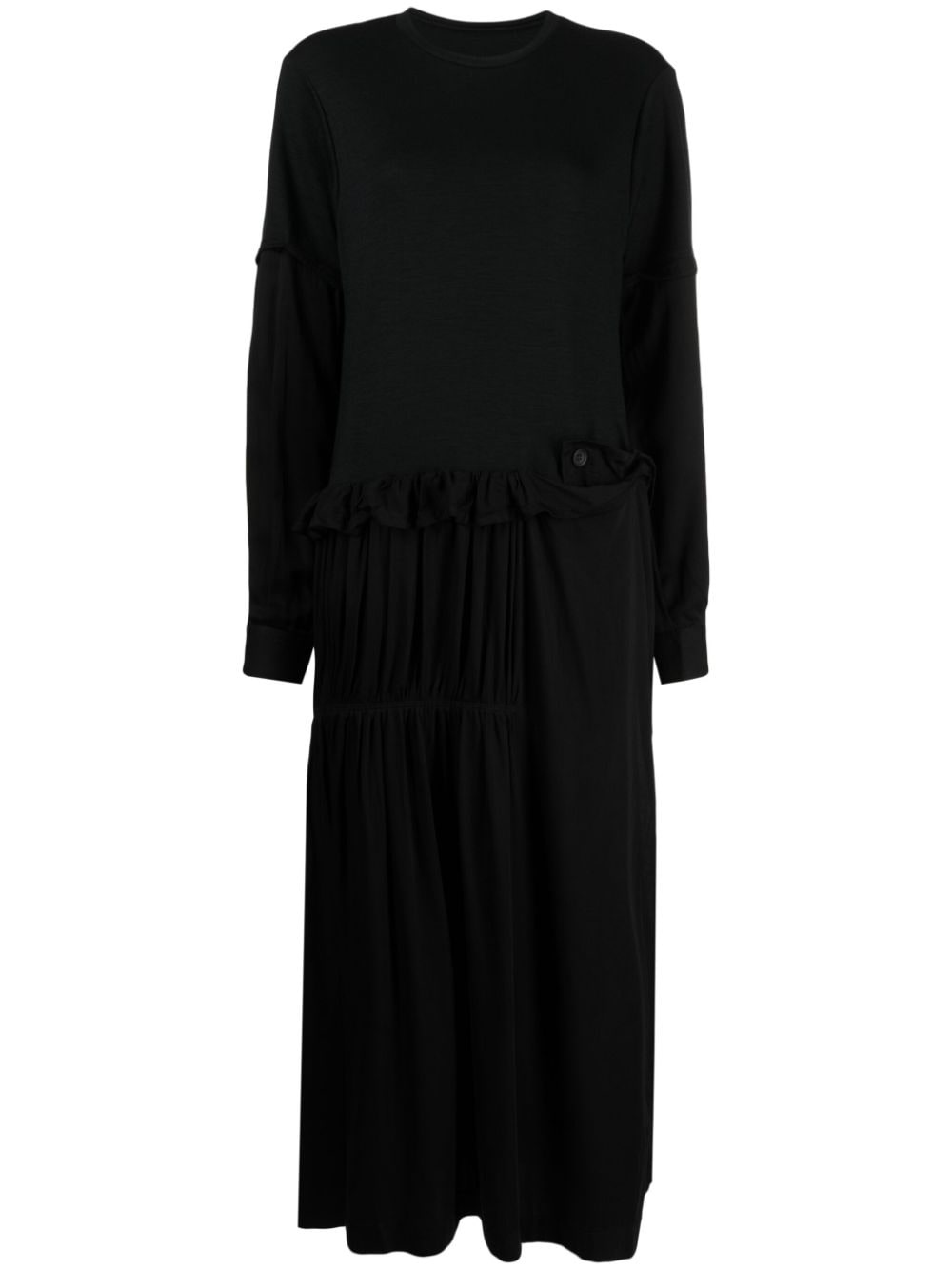 panelled tiered maxi dress Highlights - Black - Wool - Panelled design - Ruffled detailing - Crew neck - Off-centre front button fastening - Contrasting-fabric sleeves - Buttoned cuffs - Drop waist - Tiered skirt - Side slit - Ankle-length Imported Composition Rayon 100% SIZE & FIT Model measurements Height 5 ft 10 in(1.78 m) Bust/Chest 29.13 in(74 cm) Hips 35.43 in(90 cm) Waist 23.62 in(60 cm) FittingInformation Designed to be unstructured, offering a loose fit throughout Made from a midweight non-stretch fabric, this piece offers minimal elasticity when worn This piece fits true to size – take your usual size Washing instructions Dry Clean Only