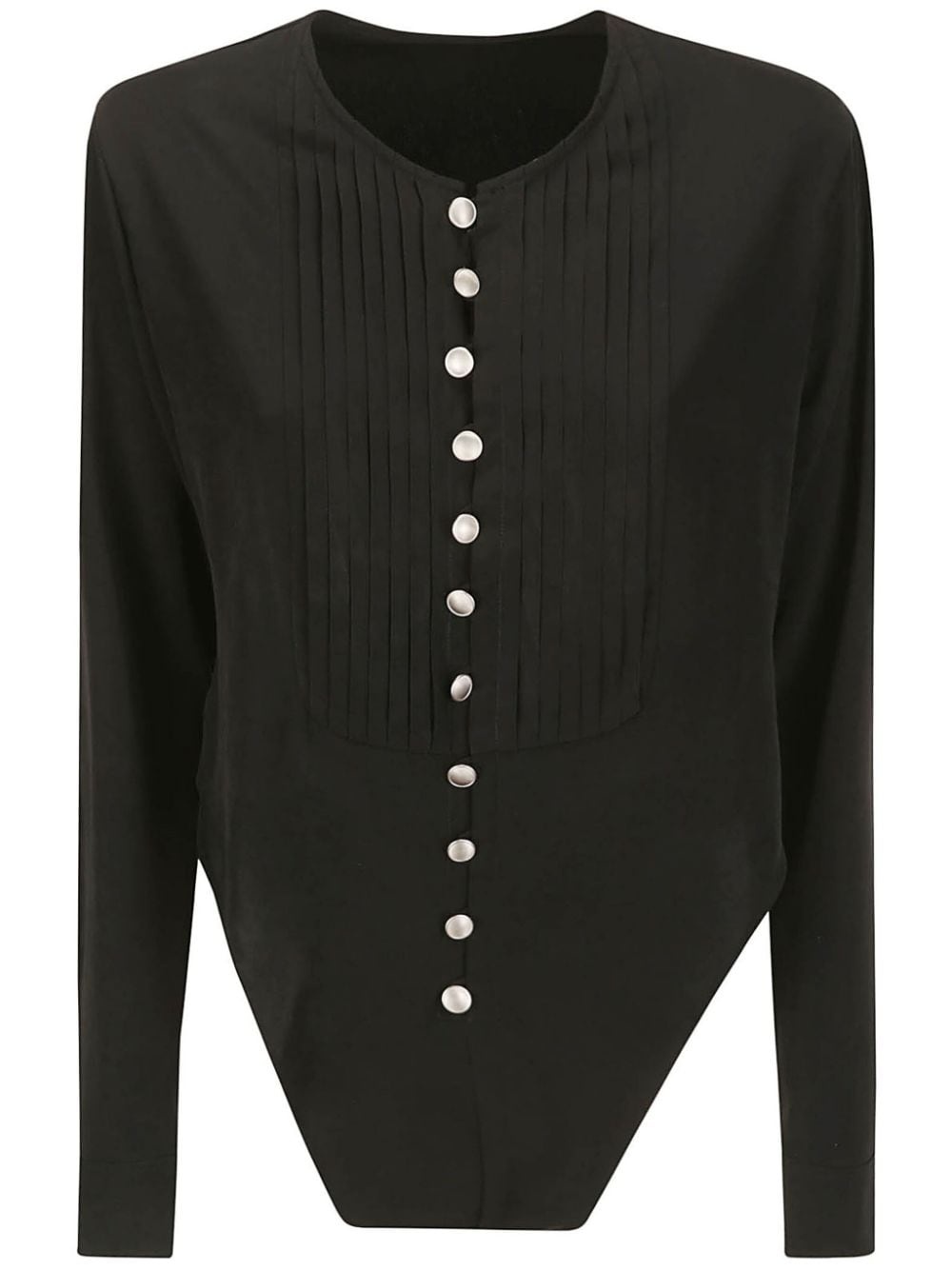 pleated asymmetric-hem blouse Highlights - Black - Pleat detailing - Round neck - Front button fastening - Long sleeves - Asymmetric hem Imported Composition Triacetate 57%, Polyester 43%