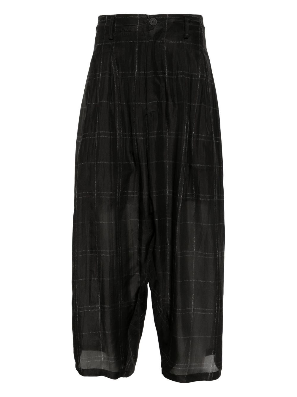 pleated plaid trousers Highlights - Black - Front button and zip fastening - Two side welt pockets - Internal drawstring fastening waist - Two rear flap pockets Imported Composition Silk 100% SIZE & FIT Model measurements Height 6 ft 2 in(1.88 m) Bust/Chest 34.25 in(87 cm) Hips 34.64 in(88 cm) Waist 26.77 in(68 cm) FittingInformation Designed with a wide leg, offering a loose and roomy fit Adjust this piece’s waistband to your preference using the drawstring Made from a lightweight non-stretch fabric