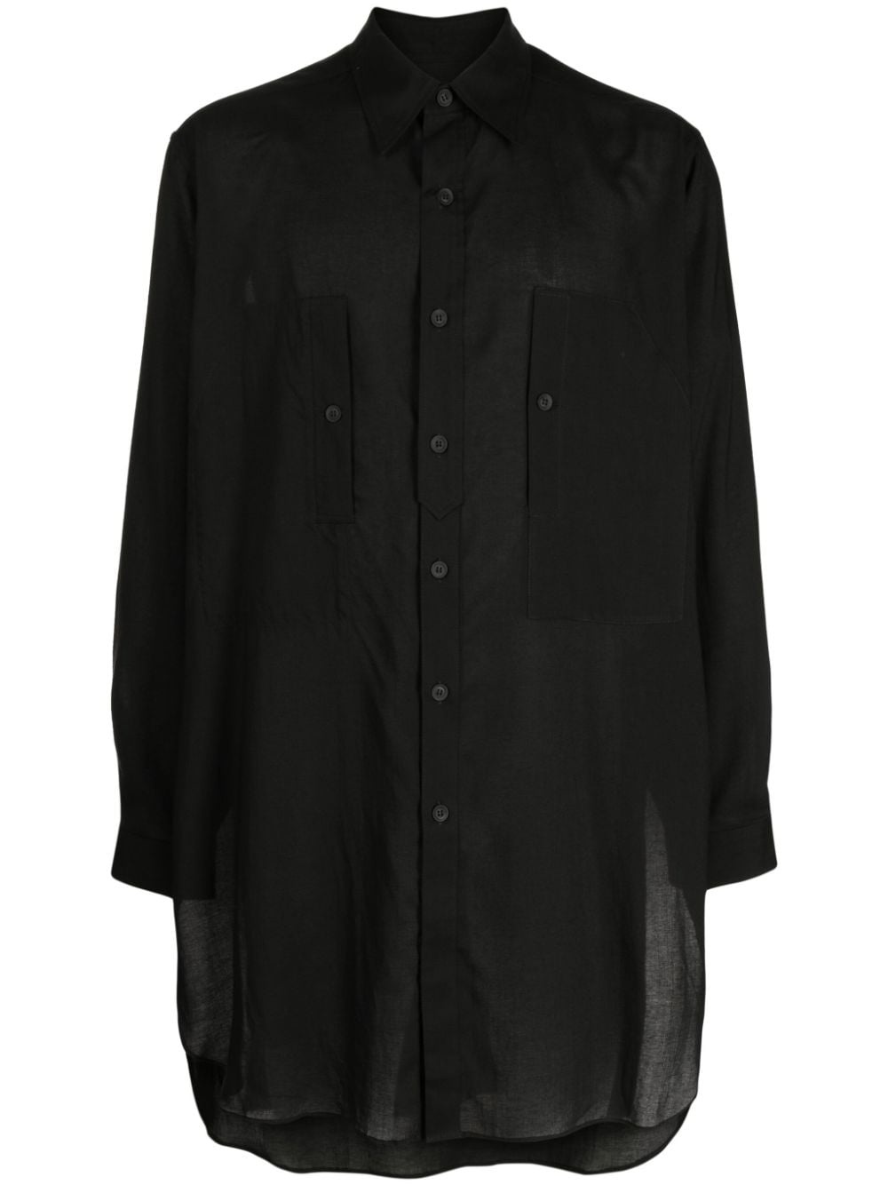 pointed-collar long-length shirt Highlights - Jet black - Lightweight - Pointed flat collar - Front button fastening - Long sleeves - Buttoned cuffs - Two button-fastening chest pockets - Short side slits - High-low hem - Long length Imported Composition Celluloid 100% SIZE & FIT Model measurements Height 6 ft 2 in(1.88 m) Bust/Chest 31.88 in(81 cm) Hips 35.82 in(91 cm) Waist 27.55 in(70 cm) FittingInformation Designed to be unstructured, offering a loose fit throughout Made from a midweight non-stretch fabric, this piece offers minimal elasticity when worn This piece fits true to size – take your usual size Washing instructions Dry Clean Only
