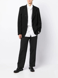 single-breasted fitted blazer black wool classic lapels button fastening long sleeves two side flap pockets Imported Composition Lining: Cupro 100% Body: Wool 100% SIZE & FIT Model measurements Height 6 ft 2 in(1.87 m) Bust/Chest 34.25 in(87 cm) Hips 36.22 in(92 cm) Waist 29.52 in(75 cm) FittingInformation This piece fits true to size. We recommend you get your regular size Cut for a loose fit Made with a mid-weight non-stretch fabric Washing instructions Dry Clean Only