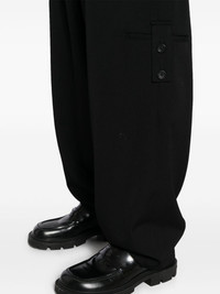 tuck tab trousers Highlights - Black - Wool - Gabardine weave - Side tabs - Front button and zip fastening - Internal drawstring fastening waist - Belt loops - Full lining - Two side welt pockets - Side welt pocket - Two rear welt pockets - Drop crotch - Tapered leg Imported Composition Lining: Cupro 100% Outer: Wool 100% SIZE & FIT Model measurements Height 6 ft 2 in(1.87 m) Bust/Chest 33.07 in(84 cm) Hips 35.43 in(90 cm) Waist 26.77 in(68 cm) FittingInformation Designed for a relaxed tapered leg, allowing a comfortable loose fit above the knee with a closer fit towards the calves Adjust this piece’s waistband to your preference using the drawstring Made from a midweight non-stretch fabric