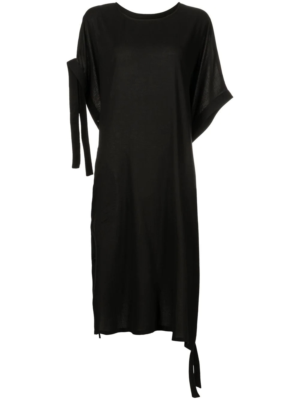buttoned side-tie midi dress black cotton jersey knit side tie fastening side button fastening round neck short sleeves straight hem mid-length Imported Composition Cotton 100% SIZE & FIT Model measurements Height 5 ft 11 in(1.8 m) Bust/Chest 28.34 in(72 cm) Hips 35.43 in(90 cm) Waist 23.62 in(60 cm) FittingInformation This piece fits true to size. We recommend you get your regular size Cut for a loose fit Made with a mid-weight fabric Washing instructions Dry Clean Only
