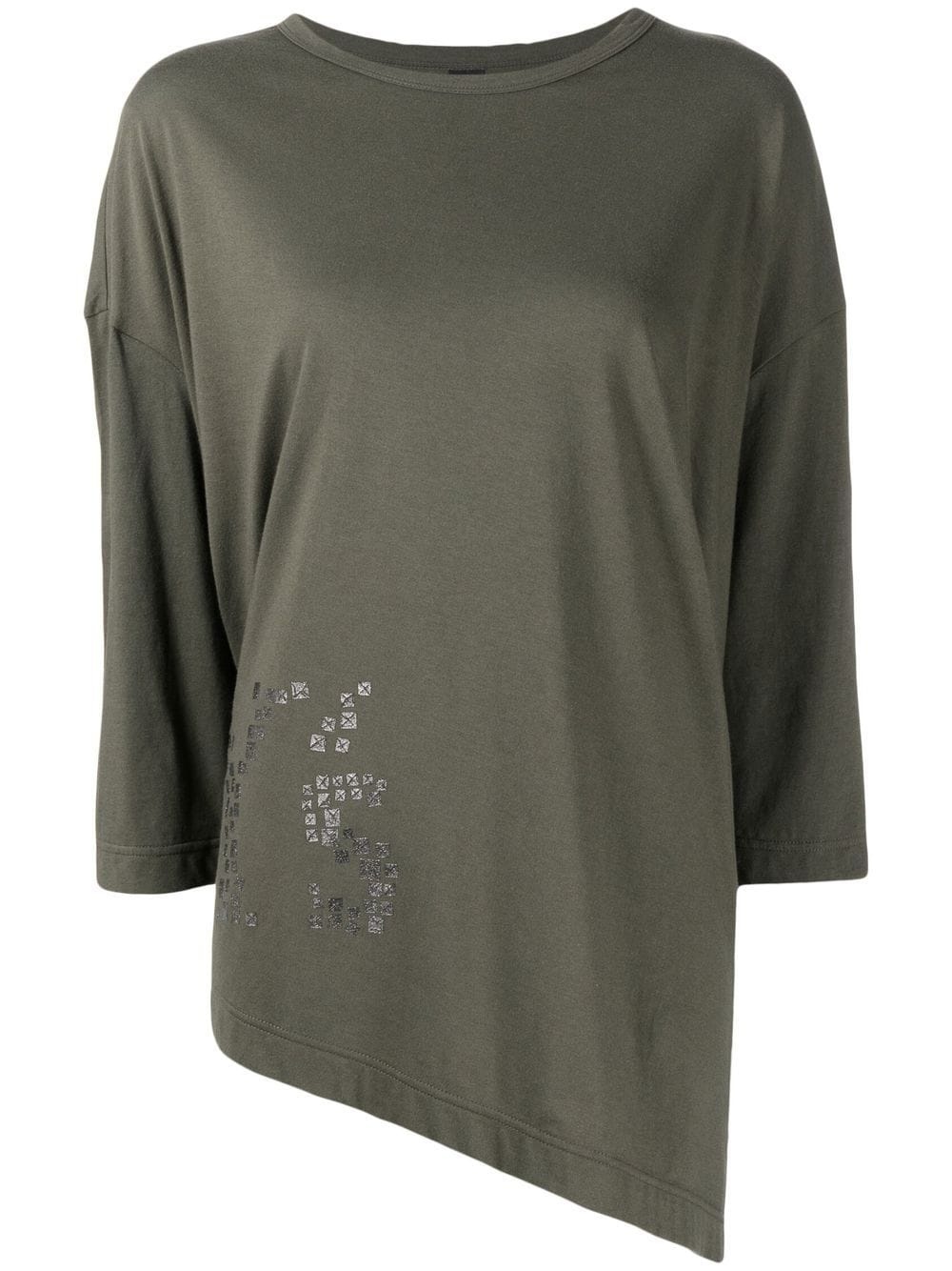 graphic-print asymmetric T-shirt khaki/dark grey cotton graphic print to the front round neck drop shoulder long sleeves asymmetric hem Imported Composition Cotton 100% SIZE & FIT Model measurements Height 5 ft 11 in(1.8 m) Bust/Chest 28.34 in(72 cm) Hips 35.43 in(90 cm) Waist 23.62 in(60 cm) FittingInformation This piece fits true to size. We recommend you get your regular size Cut for a loose fit Made with a mid-weight fabric Washing instructions Hand Wash