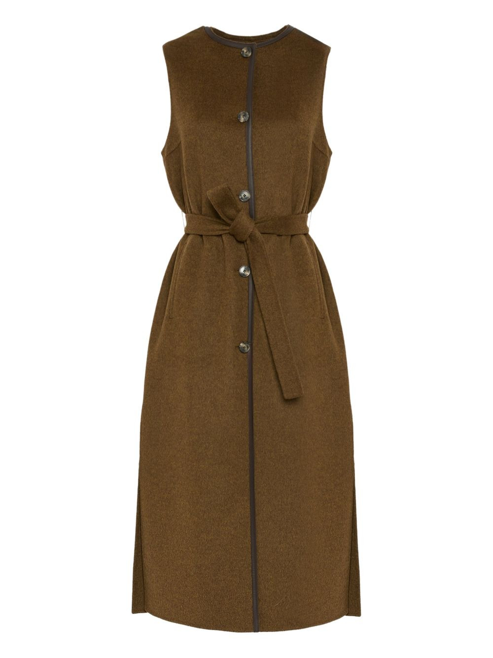 belted button-fastening gilet Highlights - Brown - Cashmere wool blend - Button front fastening - Self-tie waist belt - Sleeveless - Leather trim Made in France Composition Lamb Skin 90%, Cashmere 10% Washing instructions Read Manufacturer Guidelines