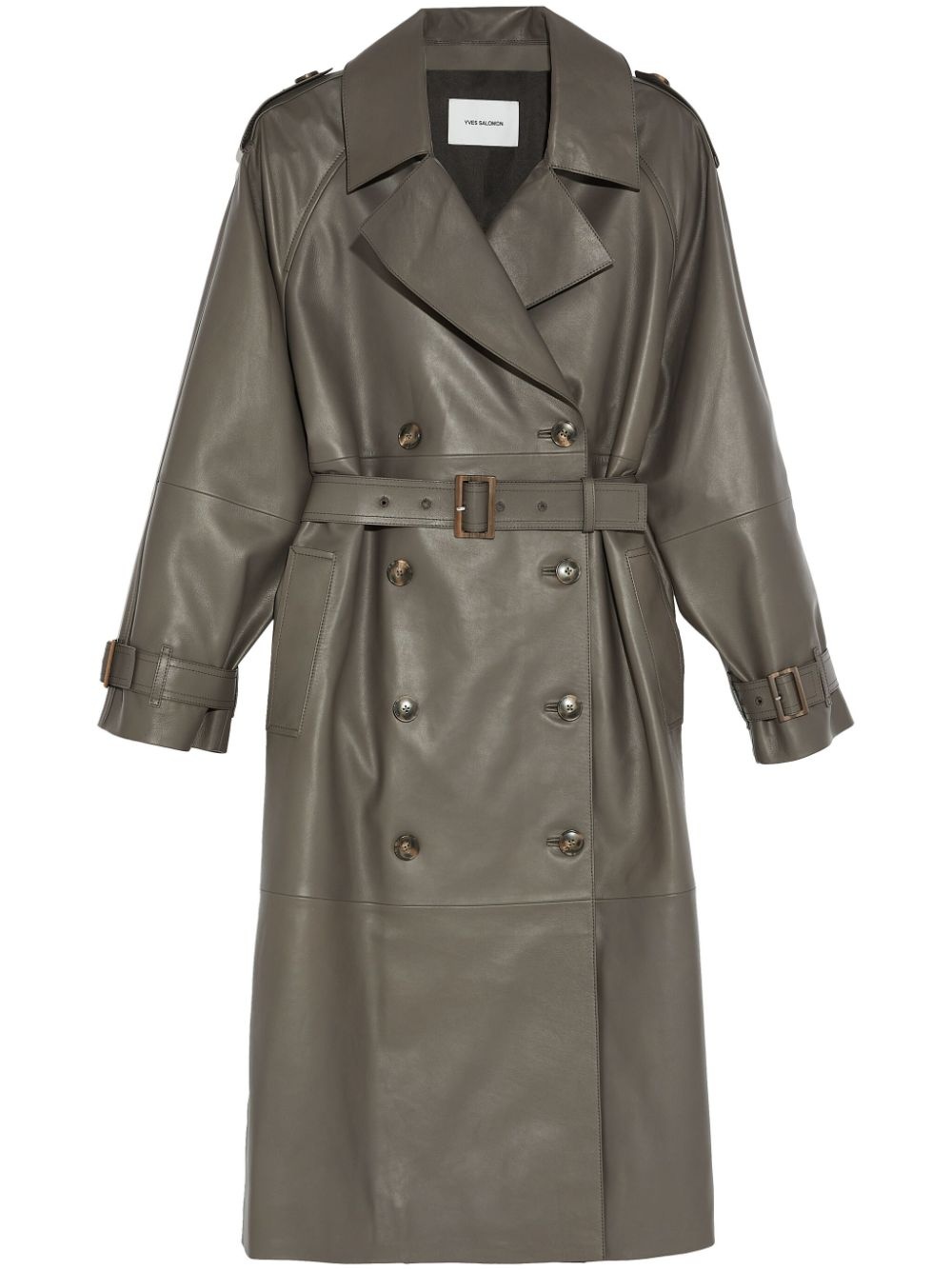 belted leather trench coat Highlights - Grey - Lambskin - Belted waist - Double-breasted button fastening - Notched lapels - Long sleeves - Belted cuffs - Full lining - Mid-calf length Made in France Composition Lining: Polyester 100% Outer: Lambskin 100%
